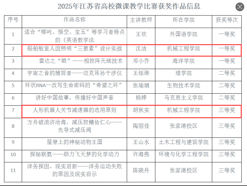 近日,江蘇省高等學校教育信息化研究會公布了2025年江蘇省高校微課教學比賽結果。我院參賽作品再創佳績, 工業設計系沈潔老師斬獲一等獎,機械制造工程系胡秋實老師榮獲三等獎,成績位居全校前列。